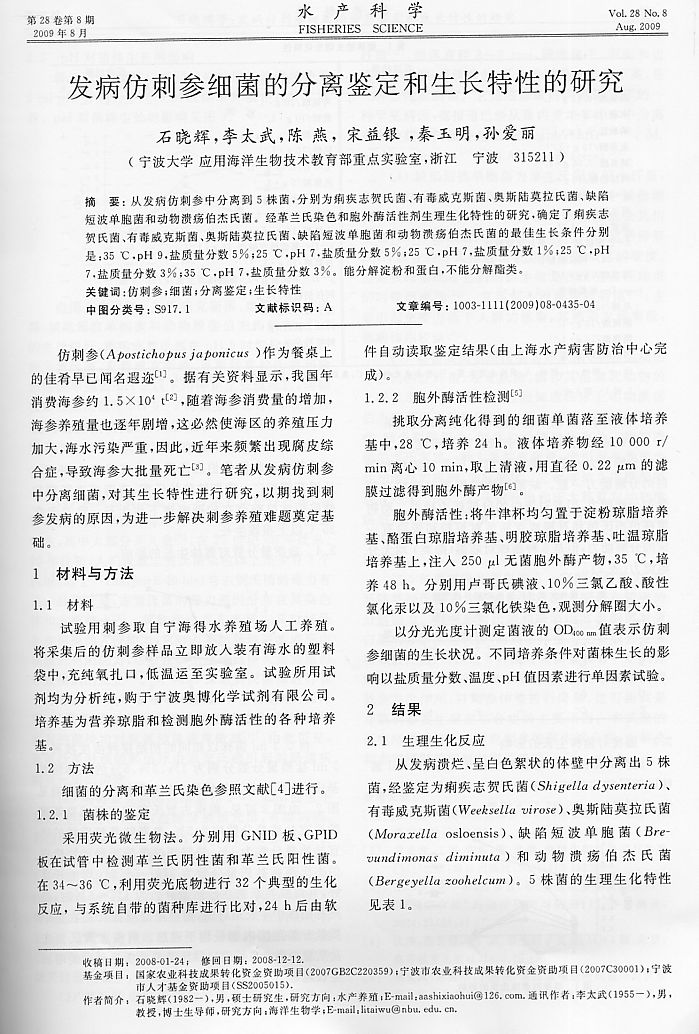 發(fā)病仿刺參細(xì)菌的分離鑒定和生長特性的研究1