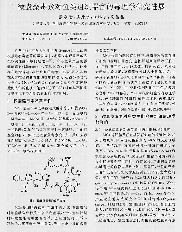 微囊藻毒素對(duì)魚類組織器官的毒理學(xué)研究進(jìn)展1