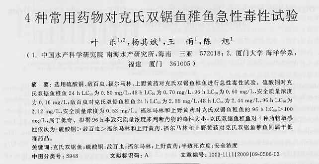 4種常用藥物對(duì)克氏雙鋸魚(yú)稚魚(yú)急性毒性試驗(yàn)