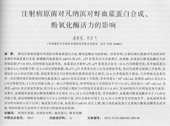 注射病原菌對(duì)凡納濱對(duì)蝦血藍(lán)蛋白合成、酚氧化酶活力的影響