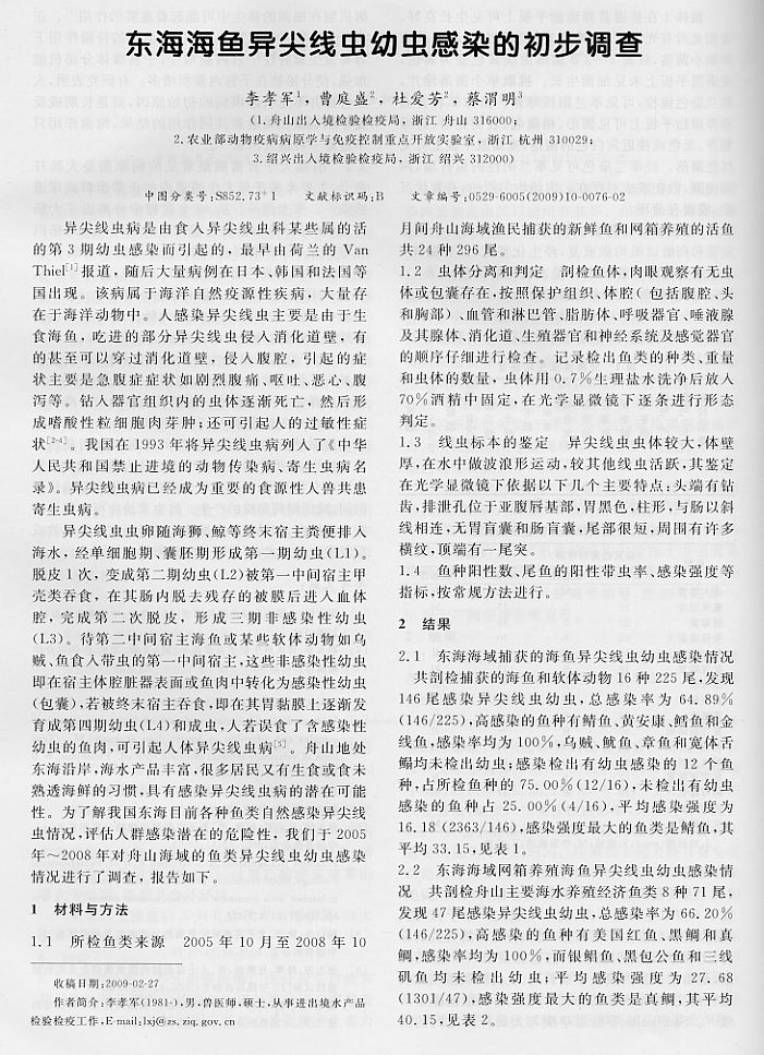 東海海魚異尖線蟲感染的初步調(diào)查1