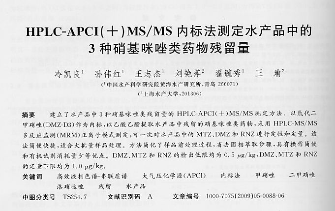 HPLC-APCL(+)MSMS內(nèi)標法測定水產(chǎn)品中的3種硝基咪唑類藥物殘留量