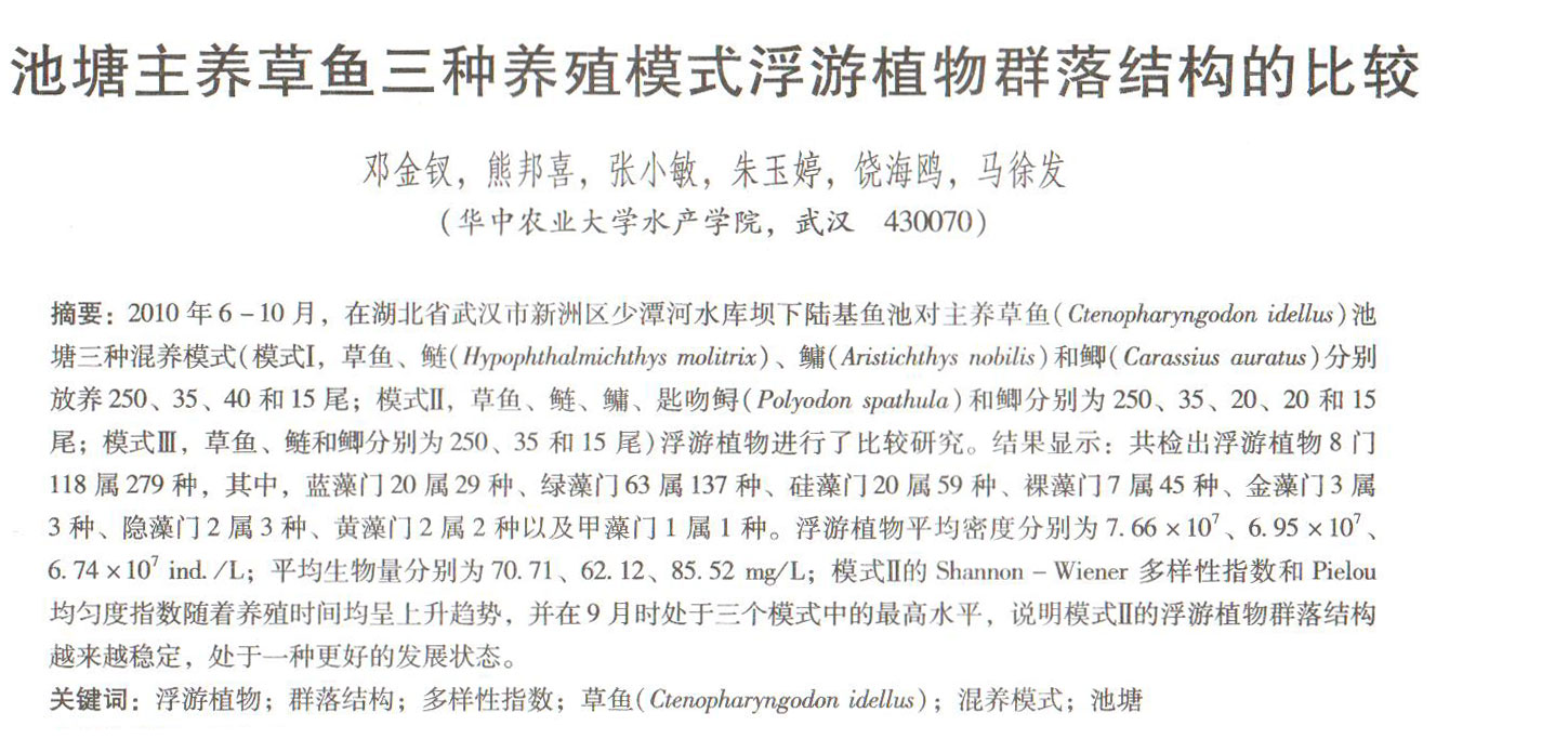 池塘主養(yǎng)草魚三種養(yǎng)殖模式浮游植物群落結(jié)構(gòu)的比較