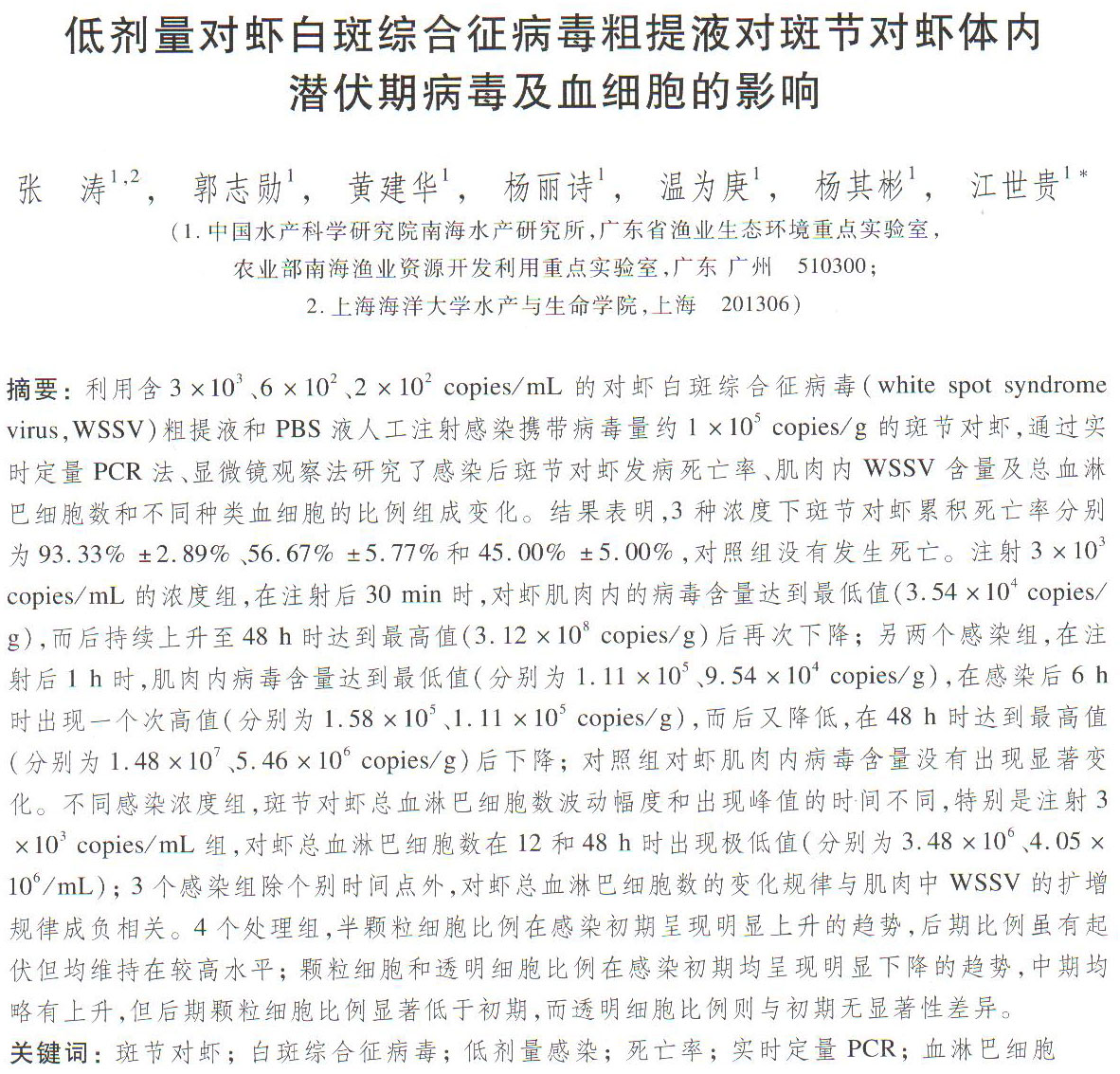 低劑量對蝦白斑綜合征病毒粗提液對斑節(jié)對蝦體內(nèi)潛伏期病毒及血細(xì)胞的影響