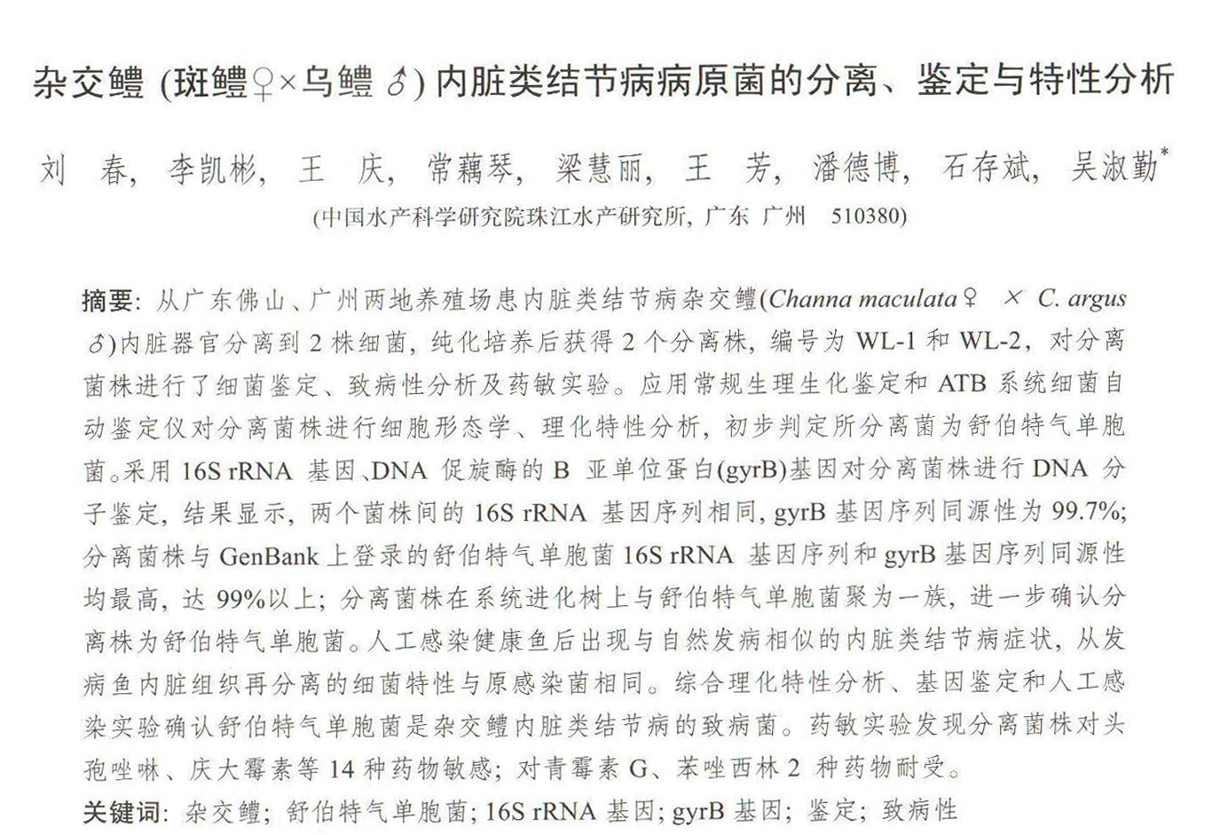 雜交鱧(斑鱧♀x烏鱧♂)內(nèi)臟類結(jié)節(jié)病病原菌的分離、鑒定與特性分析