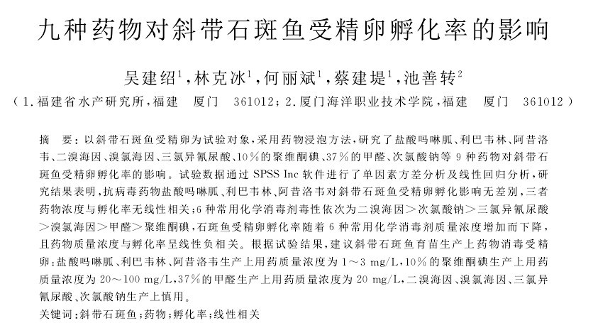 九種藥物對(duì)斜帶石斑魚受精卵孵化率的影響