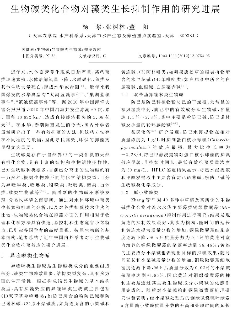 生物堿類化合物對(duì)藻類生長(zhǎng)抑制作用的研究進(jìn)展