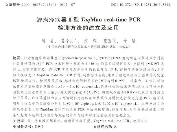 鯉皰疹病毒Ⅱ型TaqMan real-timePCR檢測方法的建立及應用