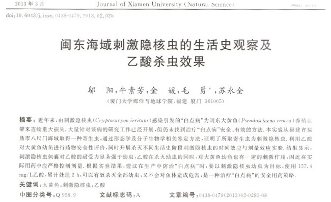 閩東海域刺激隱核蟲的生活史觀察及乙酸殺蟲效果