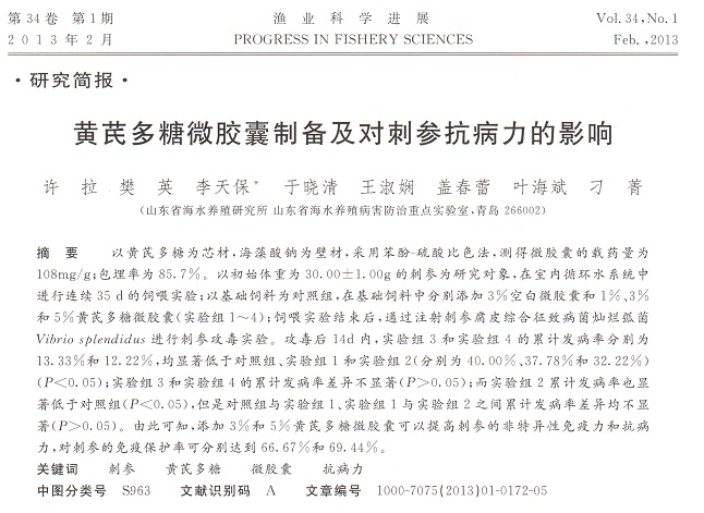 黃芪多糖微膠囊制備及對(duì)刺參抗病力的影響