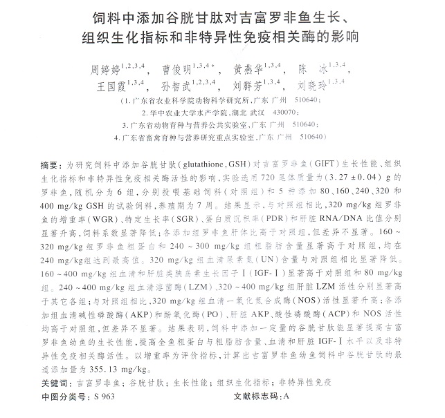 飼料中添加谷胱甘肽對吉富羅非魚生長、組織生化指標(biāo)和非特異性免疫相關(guān)酶的影響