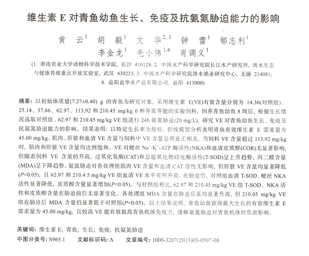 維生素E對青魚幼魚生長、免疫及抗氨氮脅迫能力的影響