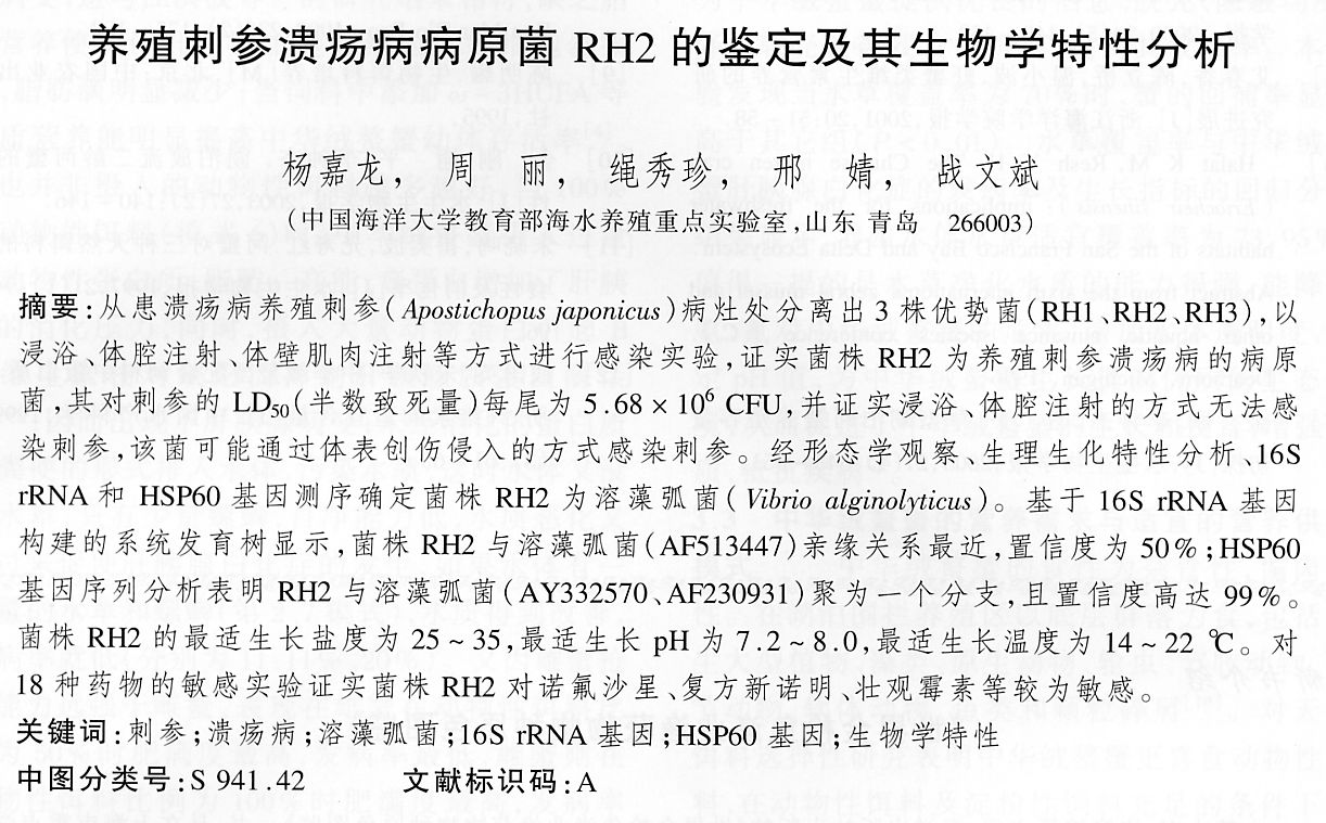 養(yǎng)殖刺參潰瘍病病原菌RH2的鑒定及其生物學(xué)特征分析