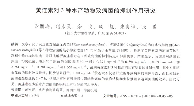 黃連素對(duì)3種水產(chǎn)動(dòng)物致病菌的抑制作用研究