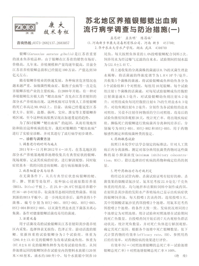 蘇北地區(qū)養(yǎng)殖銀鯽鰓出血病流行病學(xué)調(diào)查與防治措施(一)