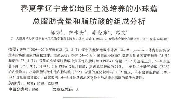 春夏季遼寧盤錦地區(qū)土池培養(yǎng)的小球藻總脂肪含量和脂肪酸的組成分析