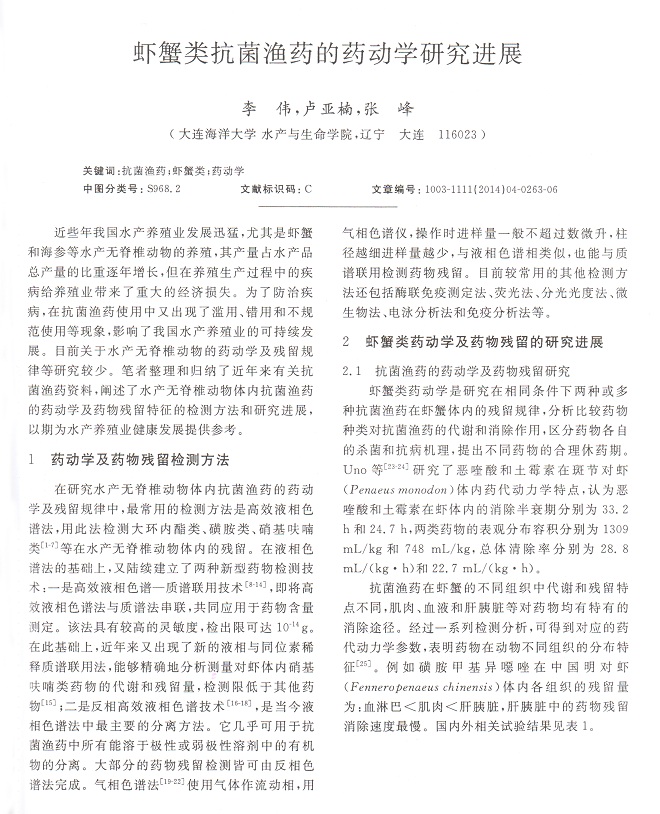 蝦蟹類抗菌漁藥的藥動(dòng)學(xué)研究進(jìn)展