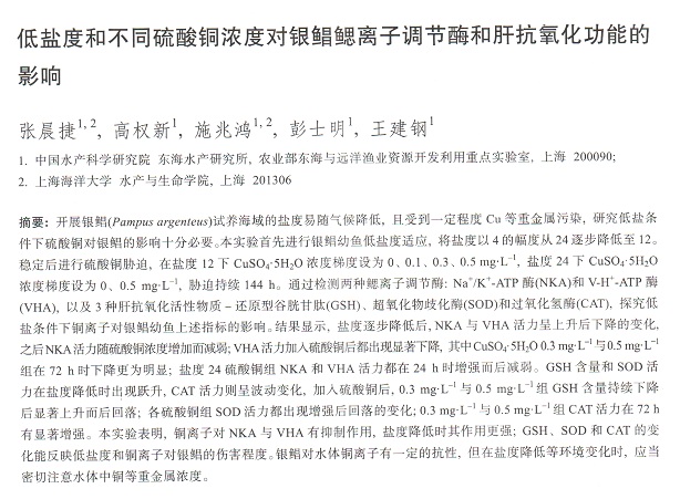 低鹽度和不同硫酸銅濃度對銀鯧鰓離子調(diào)節(jié)酶和肝抗氧化功能的影響