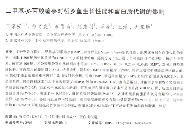 二甲基-β-丙酸噻亭對(duì)哲羅魚(yú)生長(zhǎng)性能和蛋白質(zhì)代謝的影響