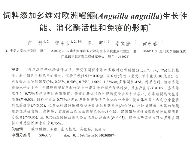 飼料添加多維對歐洲鰻鱺(Anguilla anguilla)生長性能、消化酶活性和免疫的影響