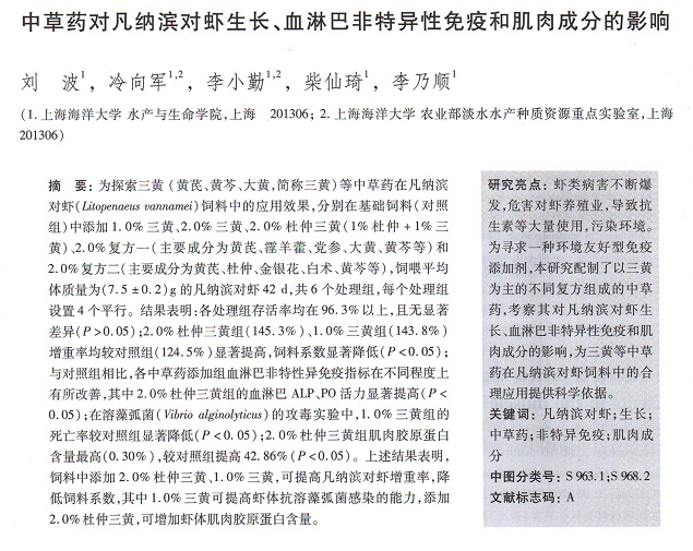 中草藥對(duì)凡納濱對(duì)蝦生長(zhǎng)、血淋巴非特異性免疫和肌肉成分的影響