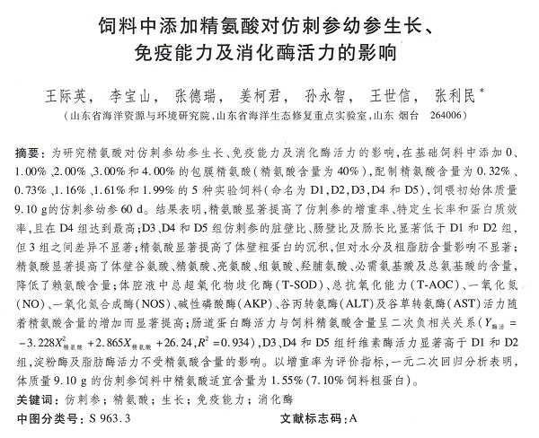 飼料中添加精氨酸對仿刺參幼參生長、免疫能力及消化酶活力的影響