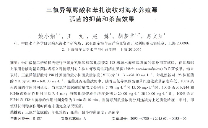 三氯異氰脲酸和笨扎溴銨對海水養(yǎng)殖源弧菌的抑菌和殺菌效果
