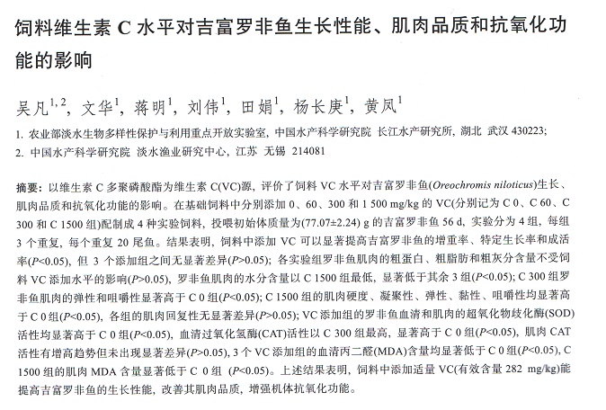 飼料維生素C水平對(duì)吉富羅非魚(yú)生長(zhǎng)性能、肌肉品質(zhì)和抗氧化功能的影響