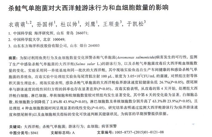 殺鮭氣單胞菌對大西洋鮭游泳行為和血細胞數(shù)量的影響
