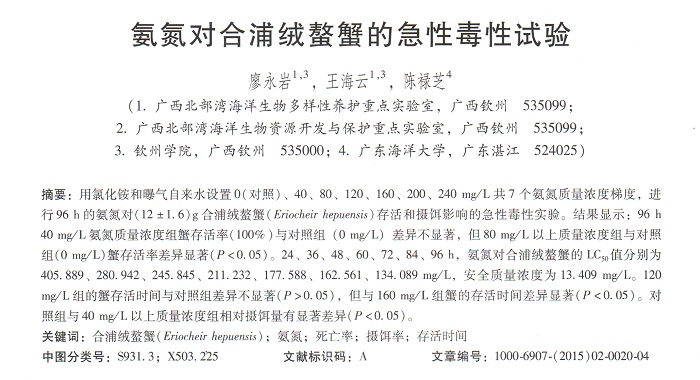 氨氮對(duì)合浦絨螯蟹的急性毒性試驗(yàn)