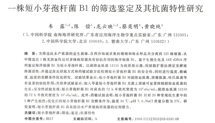 一株短小芽孢桿菌B1的篩選鑒定及其抗菌特性研究
