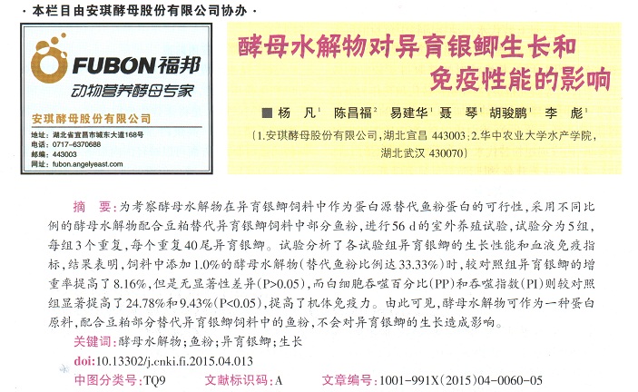 酵母水解物對(duì)異育銀鯽生長和免疫性能的影響