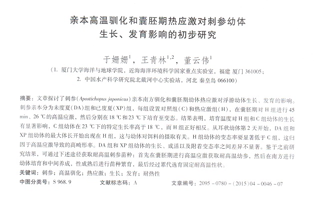 親本高溫馴化和囊胚期熱應(yīng)激對(duì)刺參幼體生長、發(fā)育影響的初步研究