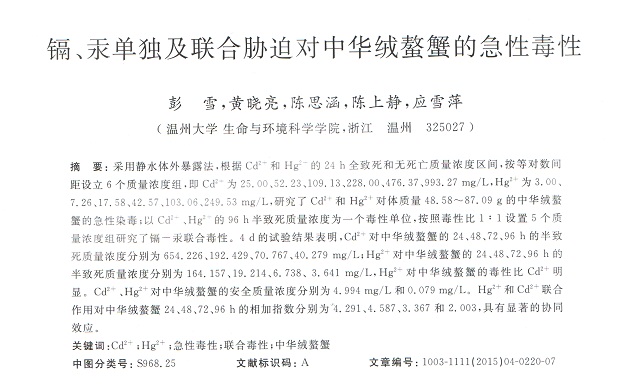 鎘、汞單獨(dú)及聯(lián)合脅迫對(duì)中華絨螯蟹的急性毒性