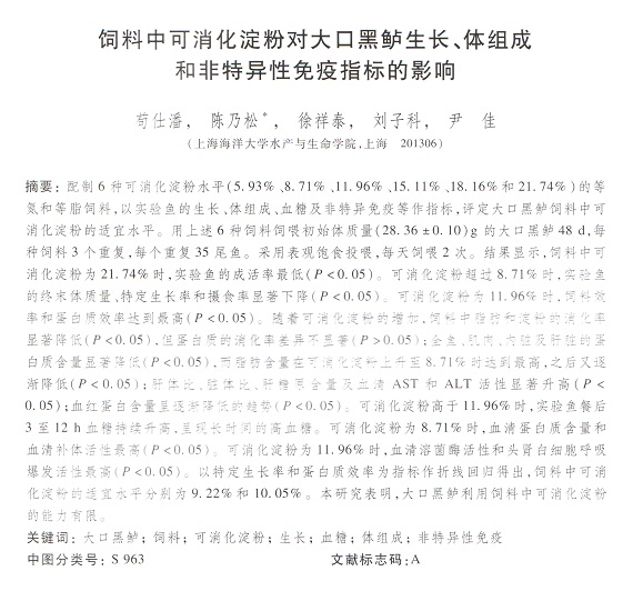 飼料中可消化淀粉對大口黑鱸生長、體組成和非特異性免疫指標(biāo)的影響