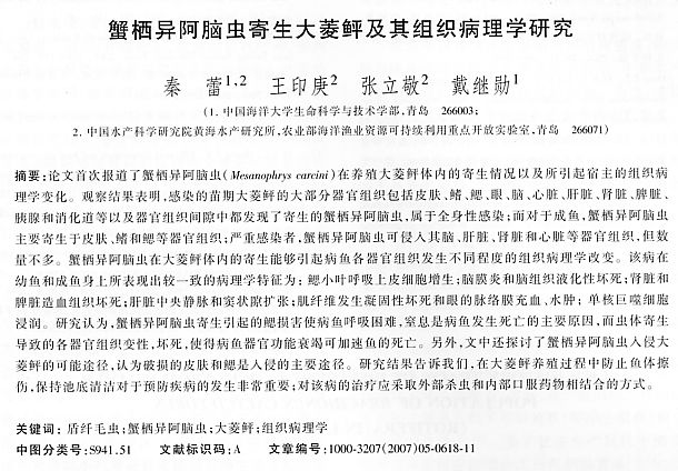 蟹棲異阿腦蟲寄生大菱鲆及其組織病理學研究