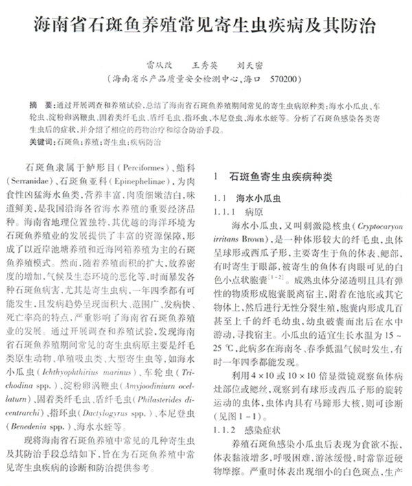 海南省石斑魚(yú)養(yǎng)殖常見(jiàn)寄生蟲(chóng)疾病及其防治
