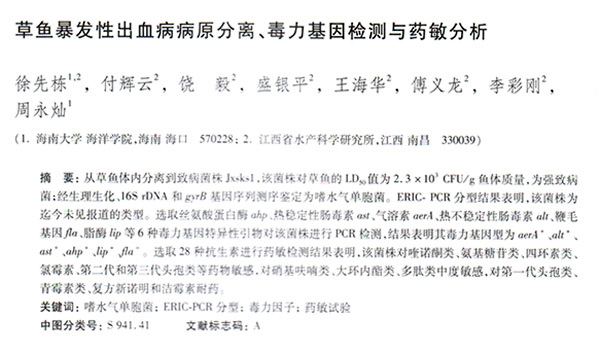 草魚暴發(fā)性出血病病原分離、毒力基因檢測(cè)與藥敏分析