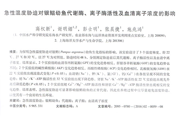 急性溫度脅迫對銀鯧幼魚代謝酶、離子酶活性及血清離子濃度的影響