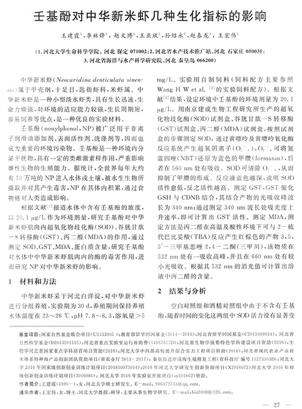 壬基酚對(duì)中華新米蝦幾種生化指標(biāo)的影響