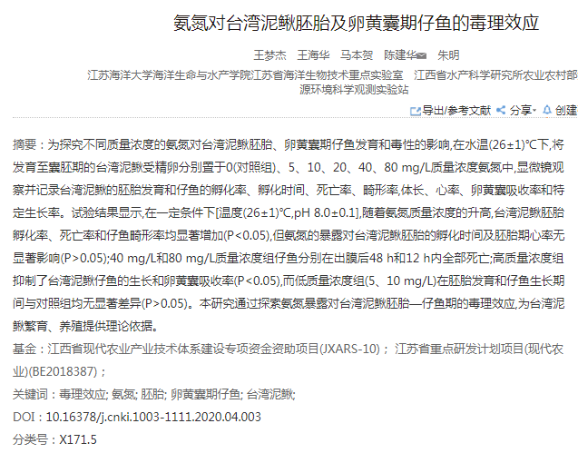 氨氮對臺灣泥鰍胚胎及卵黃囊期仔魚的毒理效應(yīng)