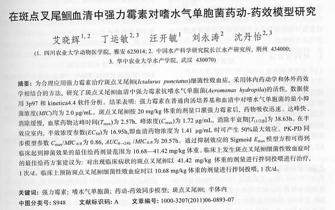 在斑點(diǎn)叉尾鲴血清中強(qiáng)力霉素對(duì)嗜水氣單胞菌藥動(dòng)一藥效模型研究