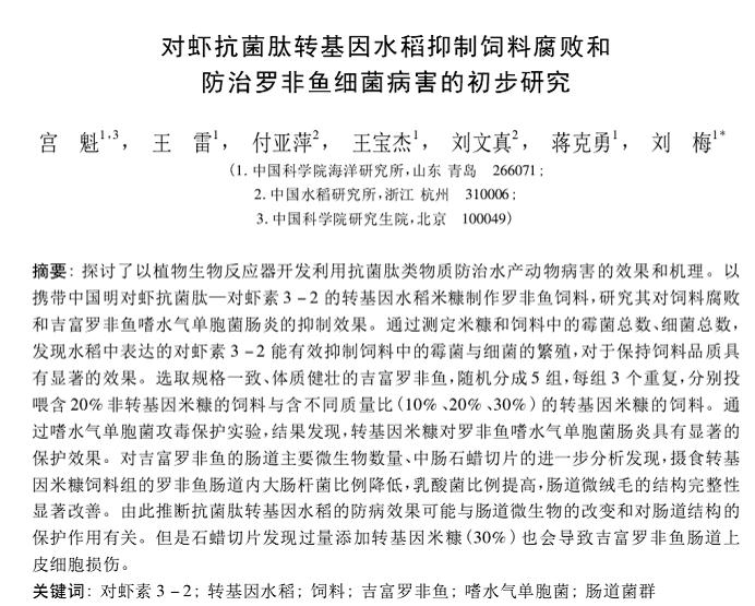 對(duì)蝦抗菌肽轉(zhuǎn)基因水稻抑制飼料腐敗和防治羅非魚(yú)細(xì)菌病害的初步研究