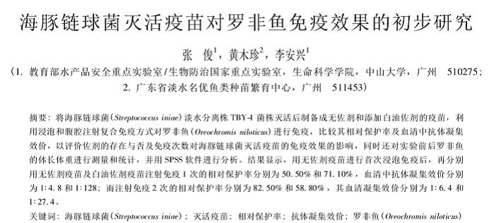 海豚鏈球菌滅活疫苗對羅非魚免疫效果的初步研究