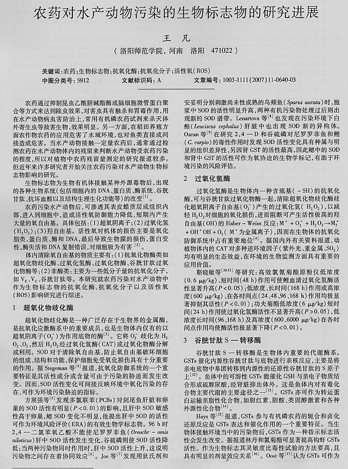 農(nóng)藥對(duì)水產(chǎn)動(dòng)物污染的生物標(biāo)志物的研究進(jìn)展1