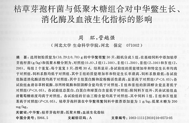枯草芽孢桿菌與低聚木糖組合對(duì)中華鱉生長、消化酶及血液生化指標(biāo)的影響