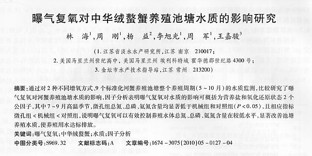 曝氣復(fù)氧對(duì)中華絨螯蟹養(yǎng)殖池塘水質(zhì)的影響研究