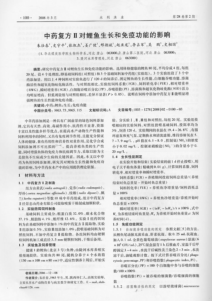 中藥復方II對鯉魚生長和免疫功能的影響1