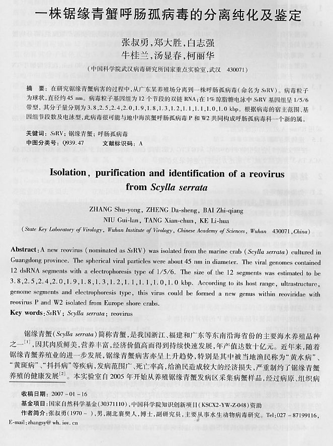 一株鋸緣青蟹呼腸孤病毒的分離純化及鑒定1