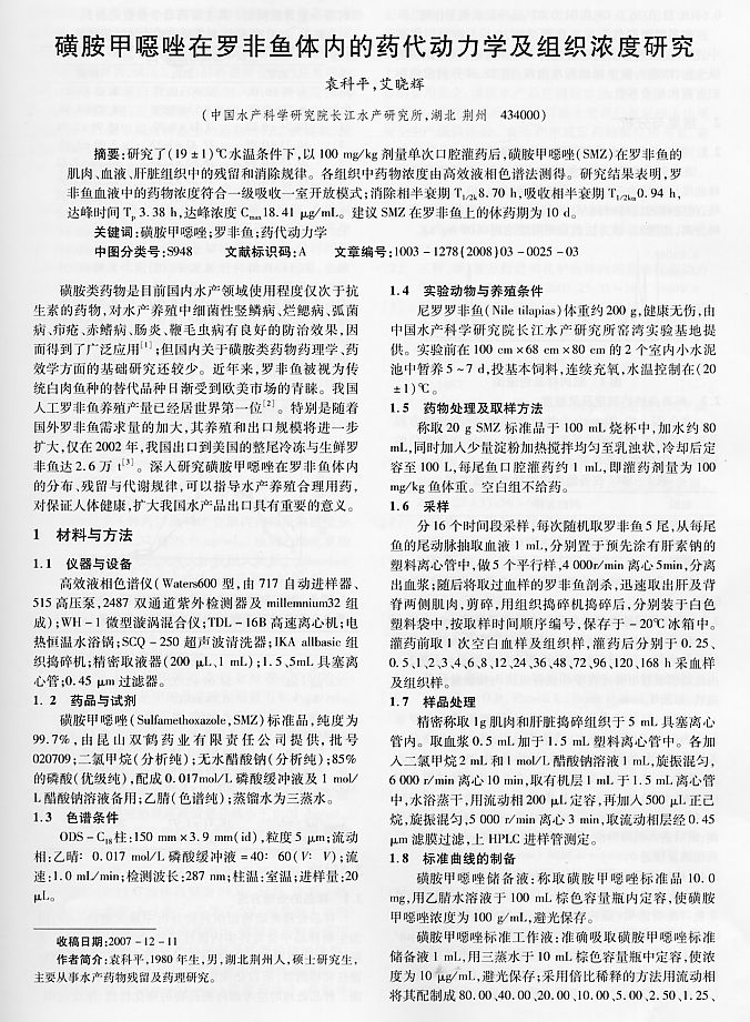 磺胺甲噁唑在羅非魚體內(nèi)的藥代動(dòng)力學(xué)及組織濃度研究1